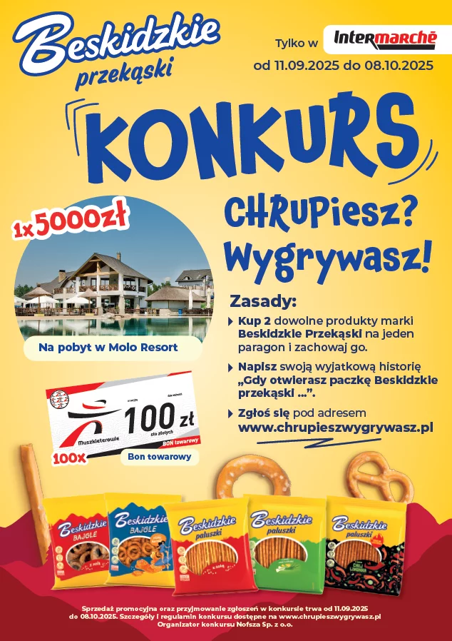 - Między 11.09.2025 r. a 08.10.2025 r. dokonaj zakupu przynajmniej dwóch produktów marki Beskidzkie Przekąski (udokumentowanym na jednym dowodzie zakupu) w dowolnym sklepie sieci Intermarche na terenie Polski.