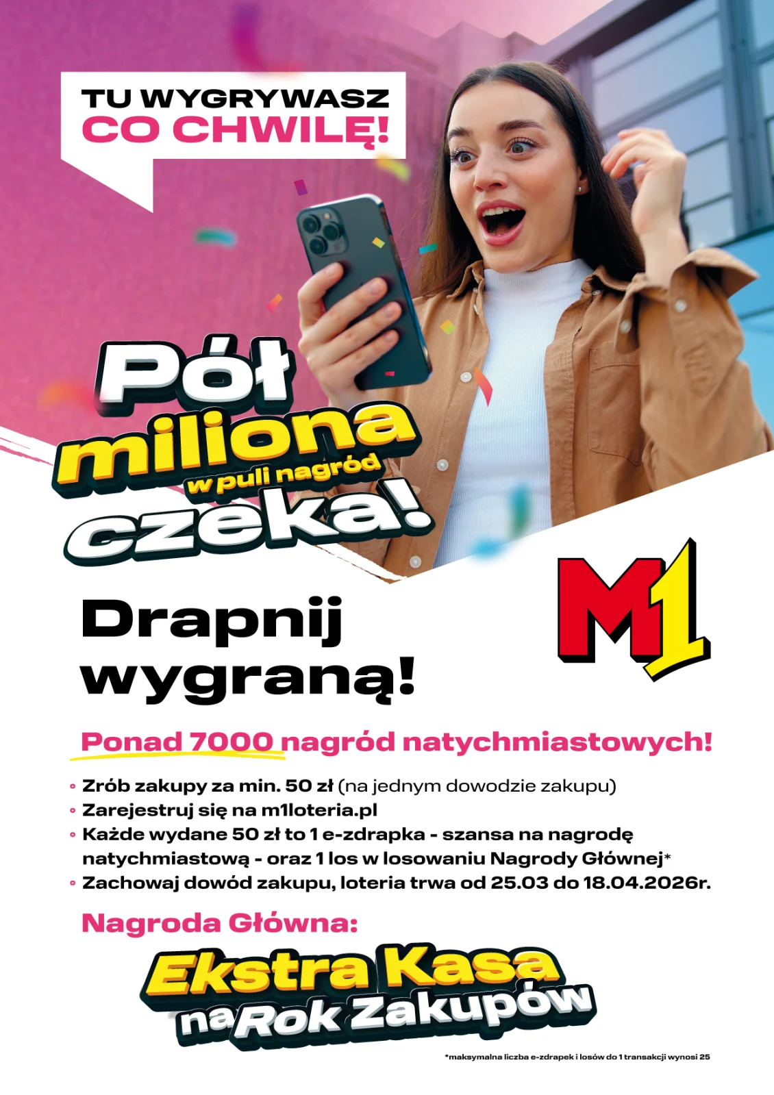 - Między 25.03.2026 r. a 18.04.2026 r. dokonaj jednorazowego zakupu towarów, usług lub Karty podarunkowej M1 na kwotę nie mniejszą niż 50 zł. brutto* w stacjonarnym sklepie znajdującym się w Centrum M1 biorącym udział w loterii.