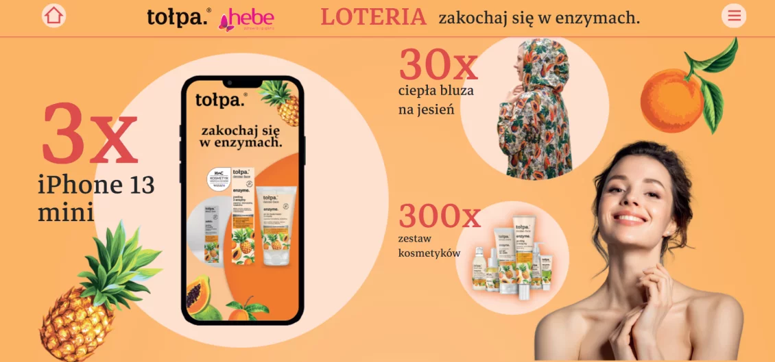Między 20.10.2022 r. a 02.11.2022 r. kup dwa produkty marki tołpa® (na jednym paragonie) w sieci sklepów Hebe, a następnie zarejestruj dowód zakupu, poprzez wypełnienie formularza, na tolpa.losofun.pl/