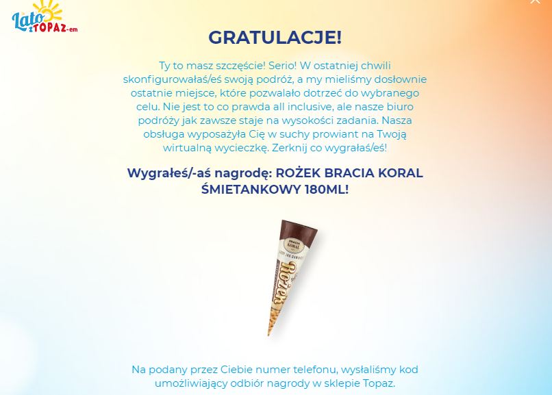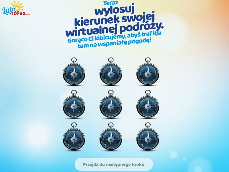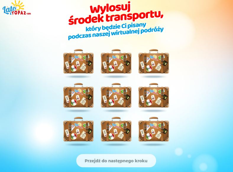 Moduły gry w promocji nawiązywały do okresu wakacyjnego, miały za zadanie przyciągnąć najmłodszych konsumentów. O wygranej decydował przede wszystkim czas zgłoszenia, ale nie tylko. Komunikat końcowy był wraz ze zdobytą nagrodą spersonalizowany i zależny od wylosowanego środka transportu oraz kierunku wirtualnej podróży. Responsywny system losowy odpowiadał uczestnikowi, uwzględniał bowiem jego wybory w wirtualnym biurze turystycznym.